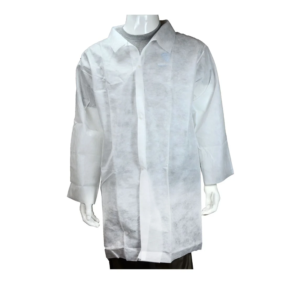 Paquete de 10 batas desechables Indian Safety Wear, de color blanco, confeccionadas en polipropileno para protección contra partículas secas. Diseñadas para un solo uso, ofrecen cobertura completa hasta la parte superior del muslo, con cuello profesional y cierre frontal de botones a presión para una colocación rápida. No incluyen bolsillos y brindan un alto nivel de comodidad y transpirabilidad. Ideales para la industria farmacéutica, laboratorios, trabajos médicos y de manufactura.