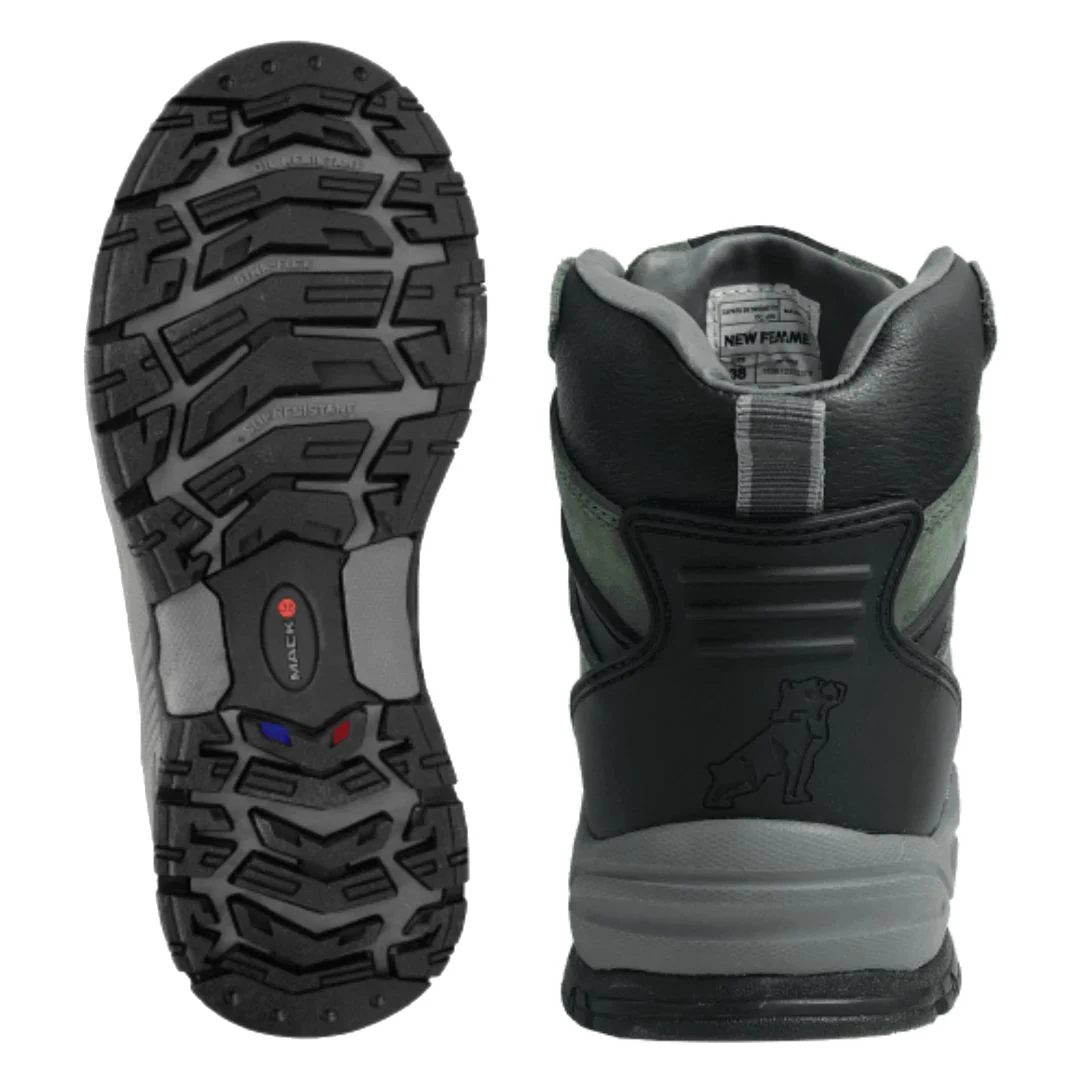 La bota dieléctrica New Femme Mack es un calzado de seguridad femenino fabricado en cuero nobuck verde con construcción cementada y entresuela de EVA para mayor comodidad y amortiguación. Cuenta con puntera de seguridad de composite, refuerzos de TPU en puntera y talón, y planta de goma antideslizante resistente a hidrocarburos y ácidos. Posee plantilla de celulosa aglomerada, contrafuerte termoformado y pasacordones textiles. Ofrece resistencia a impactos y aislamiento dieléctrico, combinando confort, estilo y protección en talla 35.