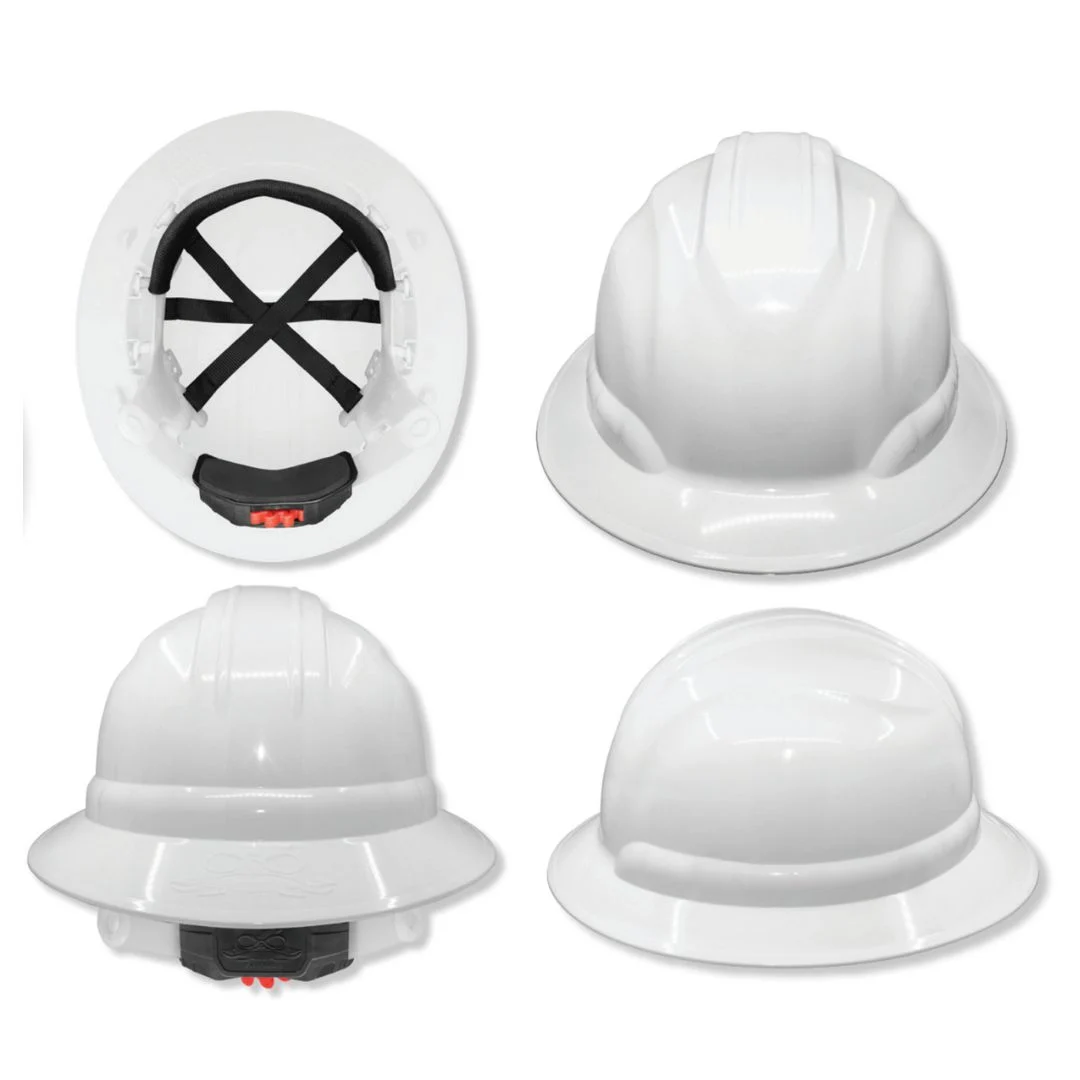 El casco ala ancha blanco de 6 puntos es un diseño ligero y de bajo perfil que ofrece protección extendida para hombros, cuello y ojos contra el sol, lluvia y otros elementos exteriores. Está fabricado en HPPE, un material resistente a condiciones climáticas y químicas, además de ser no conductor. El casco es compatible con correas de barbilla de dos y cuatro puntos. Su suspensión ajustable, que se vende por separado, incluye una almohadilla frontal absorbente de sudor para mayor comodidad, un sistema de pivote para un ajuste seguro en diferentes tamaños y formas de cabeza, y un sistema de ajuste con trinquete EZ-click. El casco viene preensamblado y cumple con el estándar ANSI/ISEA Z89.1-2014 Tipo 1, Clase E.