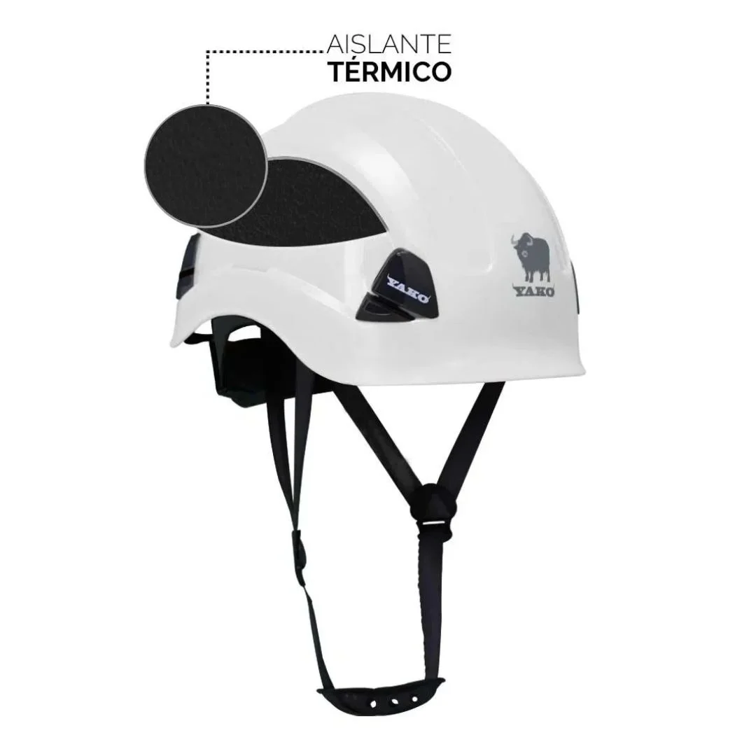 El casco para altura Yako está diseñado para actividades deportivas, trabajos en alturas y espacios confinados, ofreciendo alta comodidad y protección superior. Cuenta con aislante térmico para proteger contra temperaturas extremas, un barbiquejo de 3 puntas con enganche al casco y mentonera de silicona para mayor seguridad. Su arnés tipo ROLLER de seis puntas garantiza un ajuste perfecto. Además, incluye 4 ganchos para posicionar una lámpara minera con cinta elástica y ranuras laterales universales para accesorios y protección auditiva. Está disponible en colores blanco, amarillo y anaranjado, y cumple con la certificación ANSI Z89.1 Clase E.