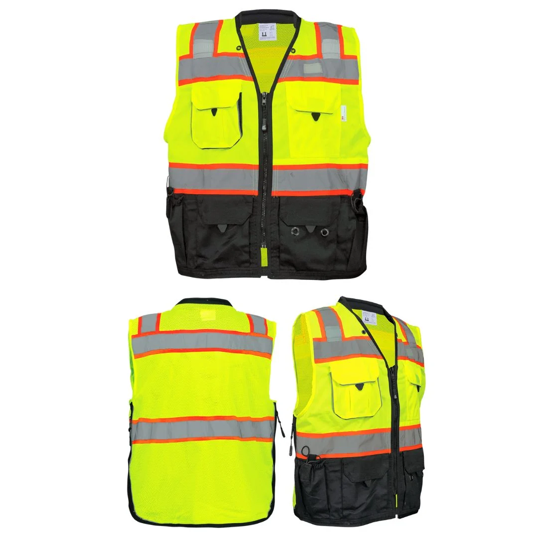 Chaleco de seguridad para ingenieros fabricado en malla de poliéster ligera amarillo/verde de alta visibilidad con paneles laterales negros para ocultar suciedad, incorpora material reflectante 3M™ con ribetes naranjas, cuello acolchado de neopreno, múltiples bolsillos exteriores e interiores para herramientas y documentos, pestañas para micrófono, ojales para sujetar cables y cierre de cremallera reforzado. Ofrece durabilidad, comodidad y transpirabilidad, cumpliendo con la norma ANSI/ISEA 107-2020, Clase 2, Tipo R, ideal para ambientes que requieren alta visibilidad y funcionalidad.