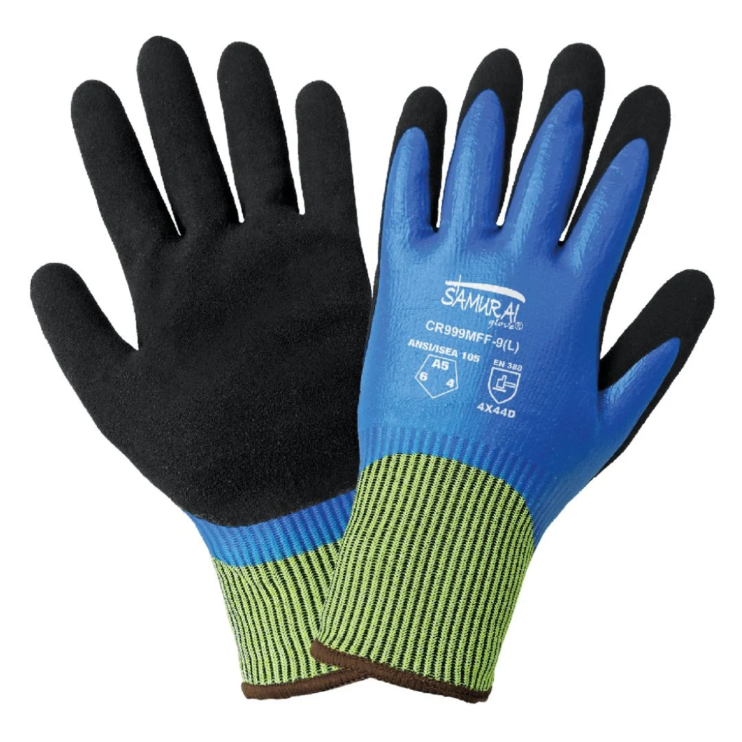 El guante de nitrilo doble inmersión Samurai está diseñado para ofrecer alta resistencia a cortes y abrasión, contando con un forro cómodo de UHMWPE Tuffalene® que además es de alta visibilidad. Su palma tiene un recubrimiento de nitrilo sumergido ¾ con acabado Mach, que garantiza un excelente agarre en condiciones húmedas y aceitosas, así como una alta resistencia a la abrasión. El recubrimiento sólido completo de nitrilo protege las manos contra líquidos. Dispone de un dobladillo con color para facilitar la identificación de la talla y un manguito tejido que asegura un ajuste cómodo y evita que los guantes se deslicen. Además, cumple con normativas antiestáticas y electrostáticas para su uso en áreas protegidas contra descargas electrostáticas (ESD). Está certificado bajo la norma EN 388 con niveles 4X44D y cumple con el estándar ANSI/ISEA 105-2016, alcanzando nivel de corte A5, abrasión 6 y perforación 4, con resultados de resistencia al corte de 2,233 gramos y perforación de 117 Newtons según ASTM F2992-15.
