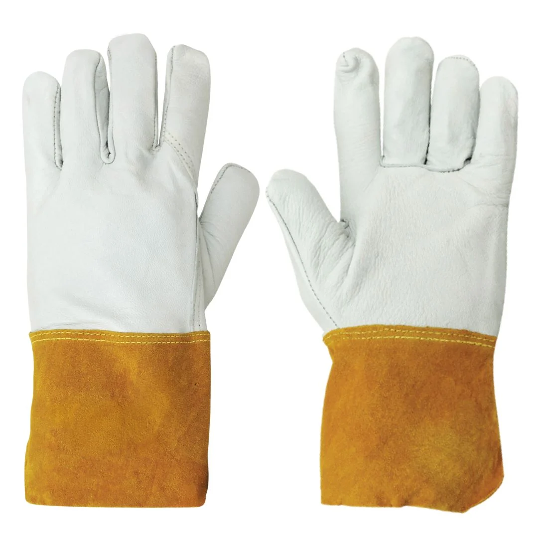 El guante de soldador MIG/TIG de cuero premium grain goatskin está fabricado con una suave cubierta de piel de cabra de primera calidad, que proporciona comodidad y durabilidad. Cuenta con costuras reforzadas en fibra de aramida para una mayor resistencia al calor y al desgaste, asegurando protección durante trabajos de soldadura. Incluye un puño recto tipo guantelete de cerraje de 4 pulgadas que facilita su colocación y retiro, además de ofrecer protección adicional al antebrazo. Su diseño incorpora un pulgar en forma de ala que mejora la comodidad, flexibilidad y reduce la tensión en las manos durante el uso prolongado.