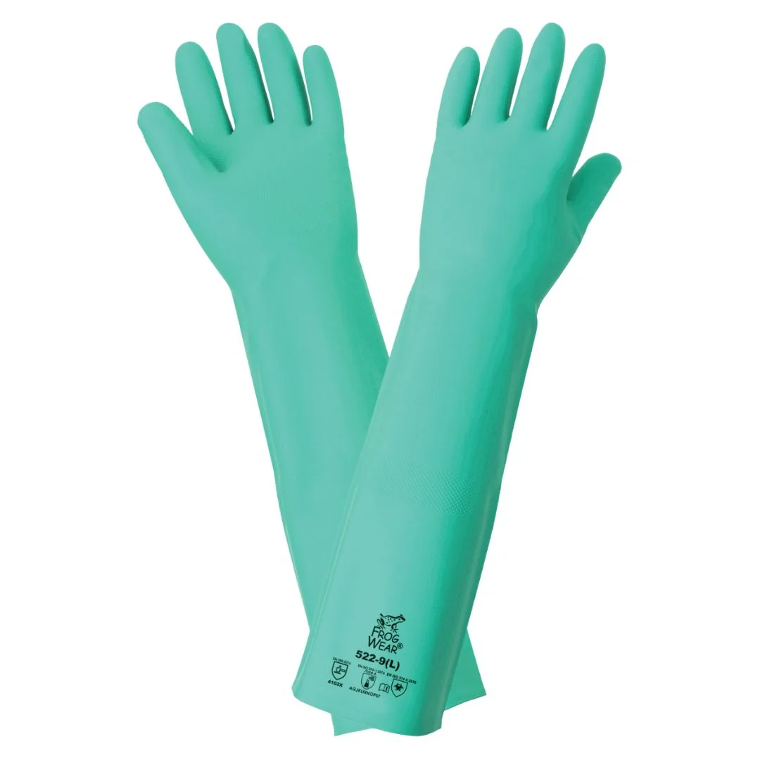 El guante de nitrilo verde sin soporte de 18 pulgadas es un guante pesado diseñado para brindar alta resistencia química y excelente agarre gracias a su patrón de diamante elevado. Cuenta con un espesor de 22 mil y un puño recto que protege el antebrazo. Su material, libre de látex natural, cumple con regulaciones de la FDA para contacto con alimentos y es clorinado para mayor resistencia química y facilidad para ponerse y quitarse. Está certificado como antiestático/electrostático para áreas protegidas contra ESD y cumple con los estándares EN 388 (niveles 4102X) y EN ISO 374-1:2016 Tipo A. Es ideal para procesamiento y manipulación de alimentos, procesamiento químico, industria automotriz, limpieza y tareas generales.