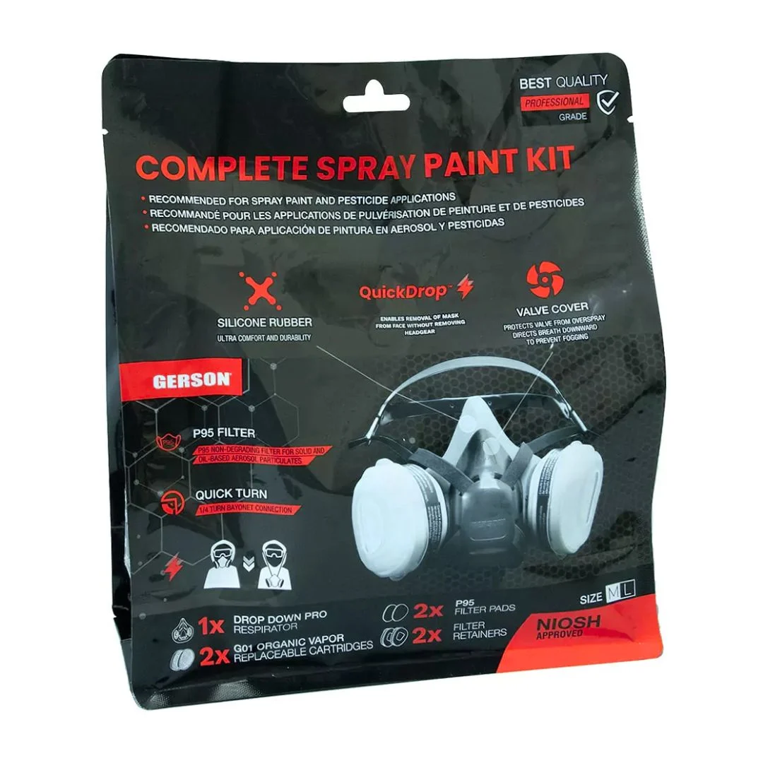 El Kit Completo de Respirador para Pintura en Spray Gerson es un equipo profesional diseñado para proteger contra vapores orgánicos y partículas durante trabajos de pintura. Incluye una máscara de medio rostro de silicona con sistema QuickDrop™ para facilitar su uso sin retirar sombrero o capucha, junto con un par de cartuchos para vapores orgánicos G01, un par de filtros G95P y retenedores. Cuenta con correas de ajuste rápido, una válvula de exhalación cubierta para evitar salpicaduras y está aprobado por NIOSH, garantizando comodidad, durabilidad y seguridad.