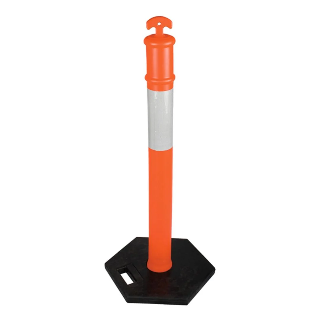 Poste de tránsito de 115 cm de altura compuesto por dos piezas para facilitar transporte y almacenamiento. Fabricado en polietileno color naranja fluorescente con bandas reflectantes para alta visibilidad, y base hexagonal negra de PVC resistente al tráfico. Cuenta con empuñadura superior ergonómica para facilitar su manejo, diseño en forma de “T” con orificios para colocar luces o cintas de barricada, e inhibidores UV que minimizan la decoloración por exposición al sol.