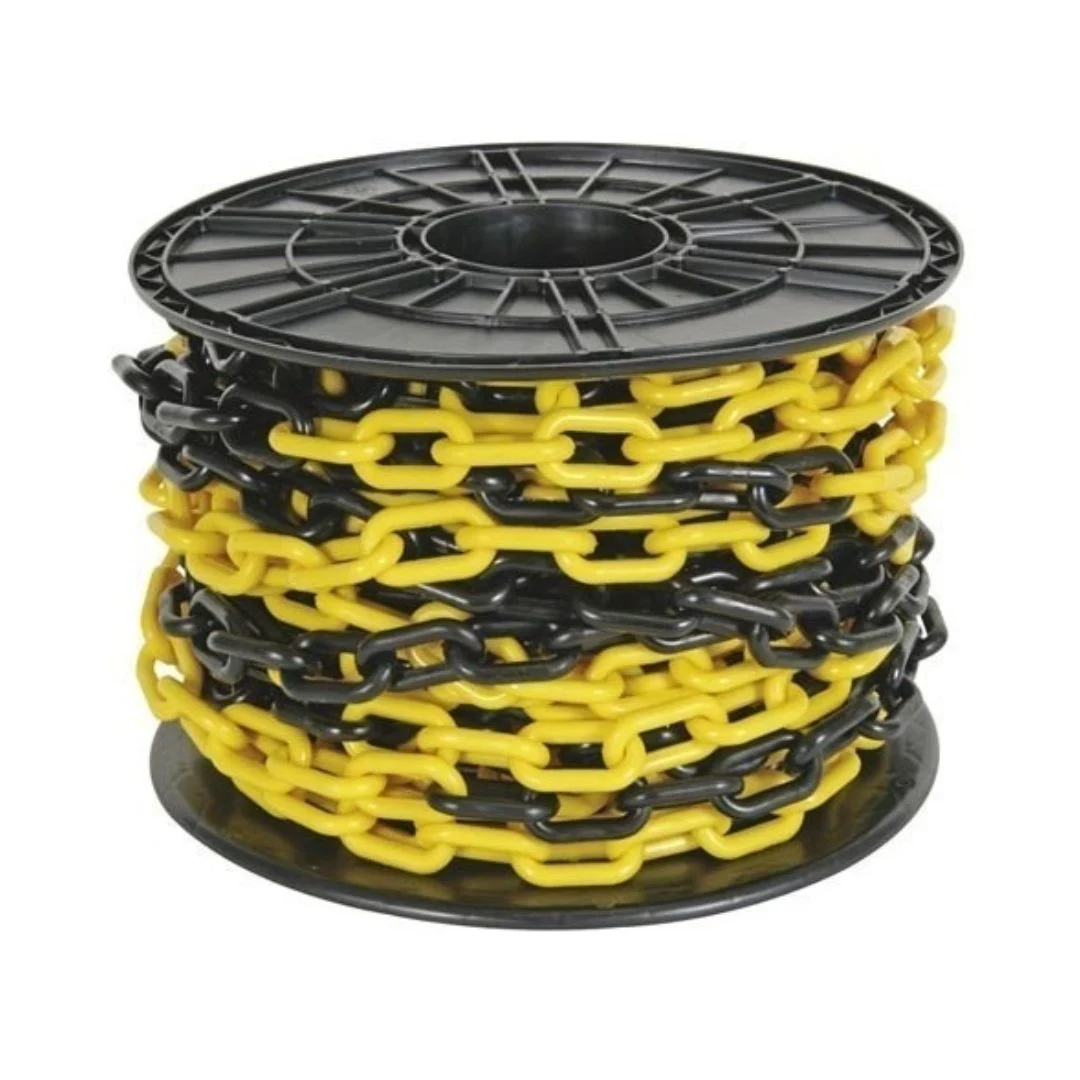 Rollo de cadena plástica bicolor amarillo y negro, fabricada en polietileno (PE) resistente, con una longitud de 25 metros y diámetro de 8 mm. Ideal para control de tráfico, barreras de acceso y delimitación en eventos y espacios como control de multitudes, paisajismo, estadios, convenciones, ferias, aeropuertos y sistemas públicos de orientación.