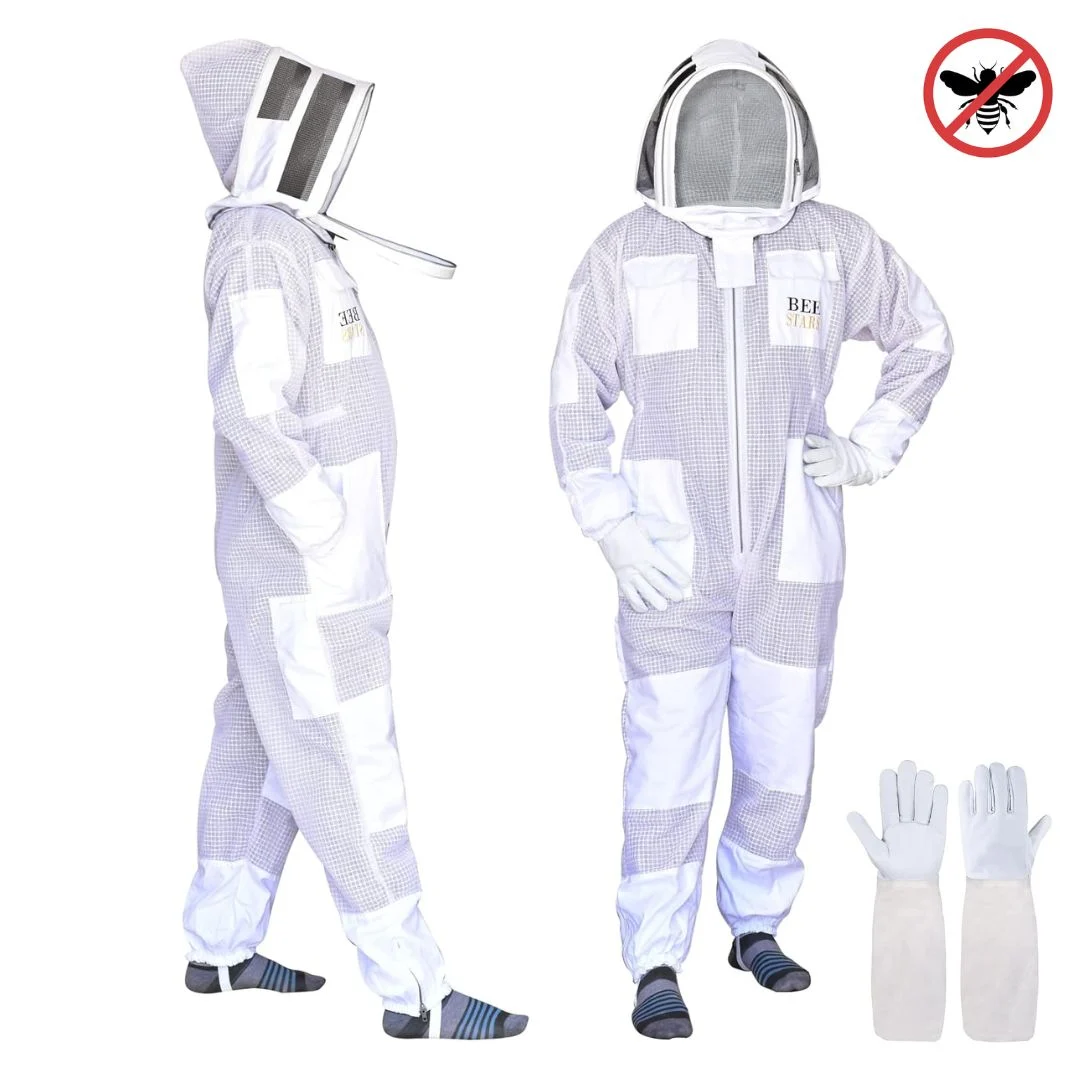 Traje de apicultura de alta calidad confeccionado con tres capas y velo de protección, diseñado para ser ventilado y resistente a picaduras. Cuenta con bolsillos de algodón ultra ventilados que mantienen la frescura incluso bajo el sol intenso. Equipado con puños expandibles en muñecas y tobillos con bucles elásticos para pulgar y pie, que pueden usarse dentro o fuera de las botas. Fabricado con malla de polialgodón en el exterior y forro interior, y una capa media de malla EVA para mayor protección y durabilidad. Diseño unisex, lavable a máquina, con capucha desmontable que se lava a mano. Además incluye un par de guantes.